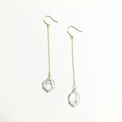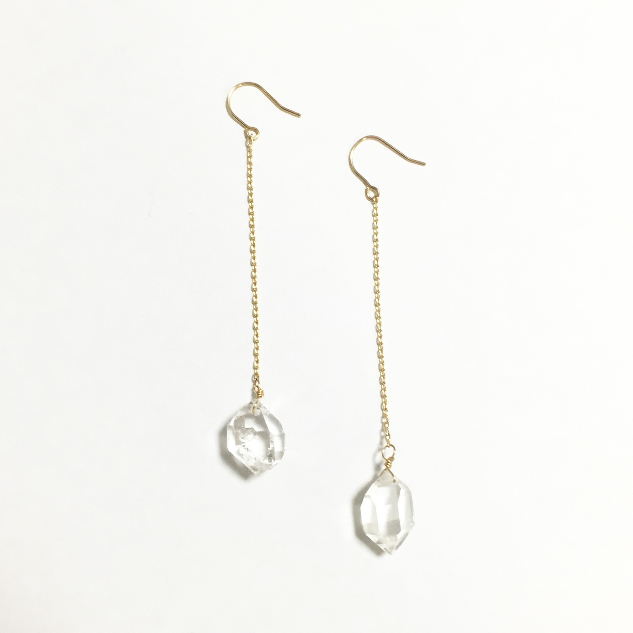 ニューヨーク州ハーキマーでのみ産出されるクォーツで、無色透明で無加工の状態でも強い輝きを放ちます。このままの状態で発掘されるので2つと同じものはありません。ダイヤモンドにもひけを取らないことから別名ハーキマーダイヤモンドとも呼ばれています。そんなクォーツのチェーンタイプのピアスです。上品で涼しげでクールにもエレガントにもお使いいただけます。