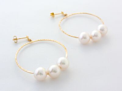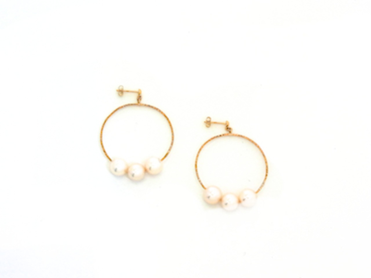 アコヤ真珠を使ったラウンド型のピアスです。ポスト部分は付き刺し型です。シリコンキャッチが付きます。片耳で3PCのアコヤ真珠がつくのでとっても華やかです。柔らかい女性らしさを演出できます。