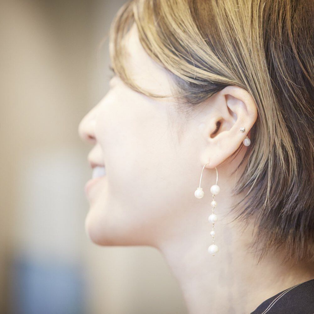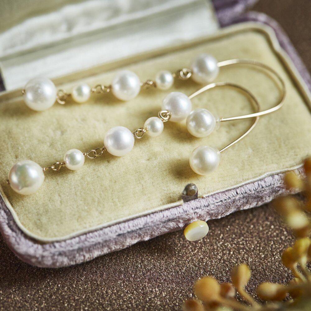 良質なサイズ違いのアコヤ真珠が動くたびに表情を変えてくれます。裏表逆に使用してもまた印象が変化し素敵です。